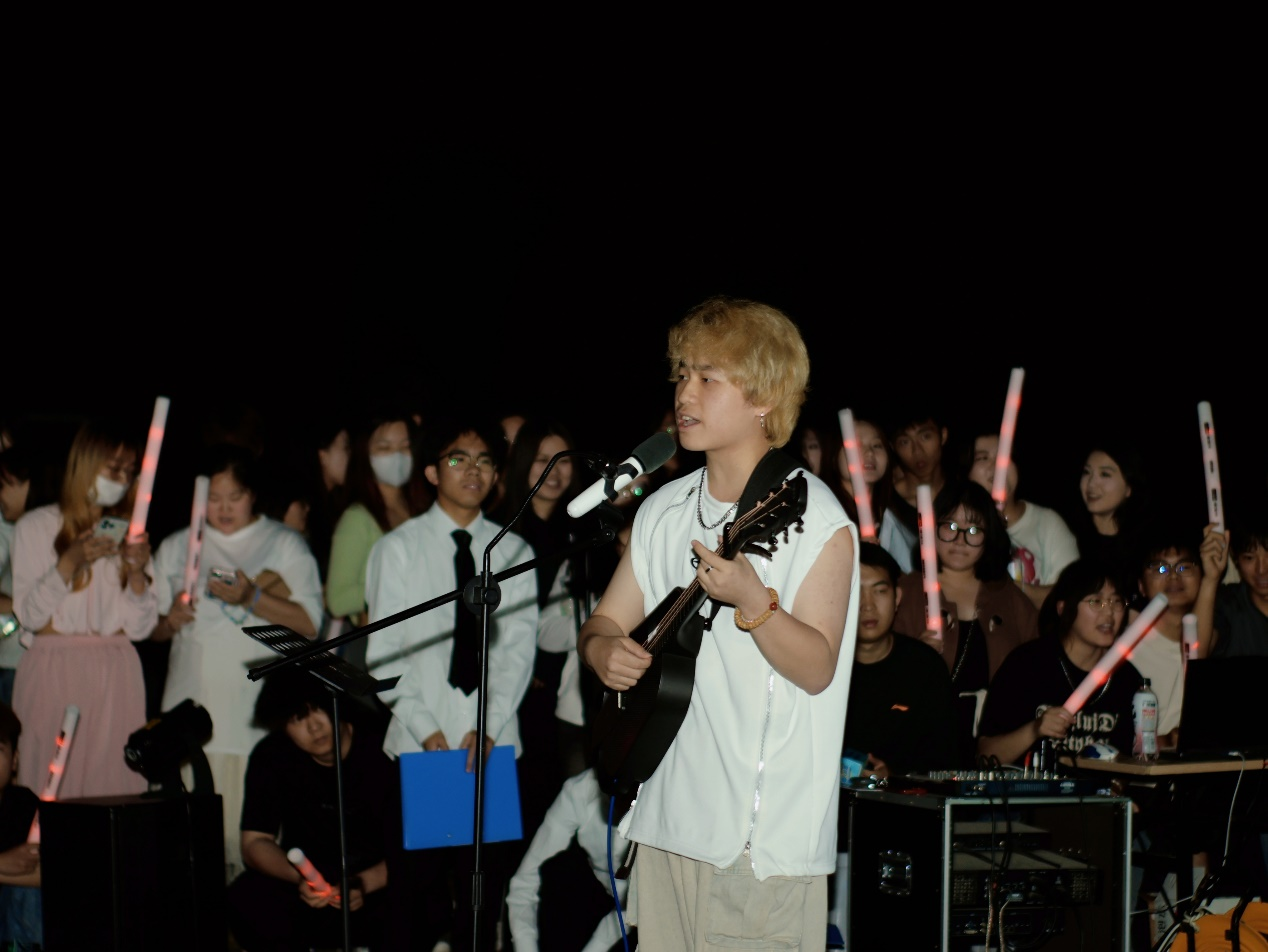 光束划过夜空,各色光带在雾霭中跃动,青春绚烂如光,青春澎湃如歌🔊,华丽的灯光秀和着音乐将现场彻底点燃。一首《鼓楼》拉开草地音乐节的序幕🤩,吉他奏响,带我们走入音乐的世界,阵阵舒爽的晚风伴着旋律,让现场的同学们拥有去面对困难和孤独的勇气。
