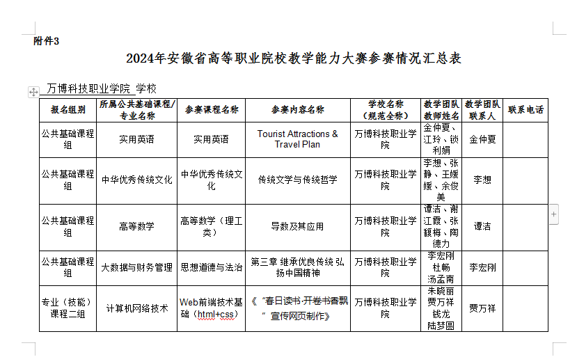 根据《安徽省教育厅关于举办2024年安徽省高等职业院校教学能力大赛的通知》(皖教秘高[2024]53号),在规定时间内,全校共收到8个参赛作品,其中🦵🏻:公共基础课程组4个,专业(技能)课程一组3个,专业(技能)课程二组1个。现将参赛作品名单予以公示👩🦲👨🏽🍼。