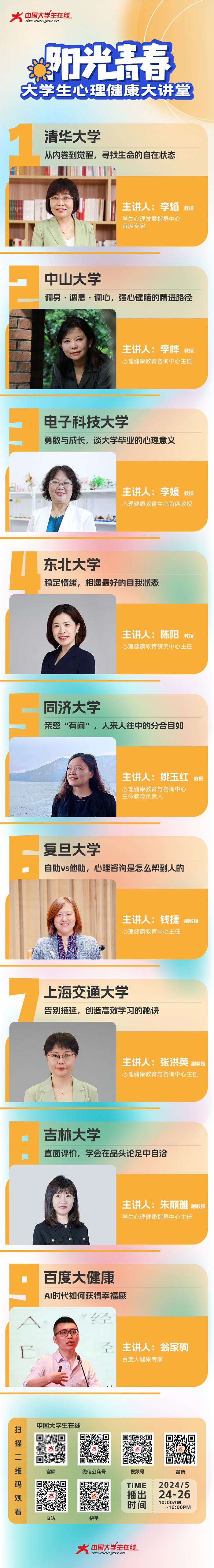 各位老师,大家好🫳,为积极响应教育部提出的“全国学生心理健康宣传教育月”开展形式多样的宣传教育活动🧘🏽♀️。中国大学生在线与清华大学策划,联合上海交通大学🦸🏻♀️、复旦大学🌍、同济大学、中山大学、东北大学🧍、吉林大学👩⚖️、电子科技大学共8所高校和百度大健康1家企业围绕疏导大学生共性的心理困惑、培养积极的心理品质♔、树立正确的健康理念等方面精心研发9门“阳光青春”大学生心理健康大讲堂精品微课🚪,于5月24日—26日期间重磅推出。届时🔦,各高校可登录在线心理健康专题的学习专区或心理微课栏目线上组织学生观看学习(官网支持回看)