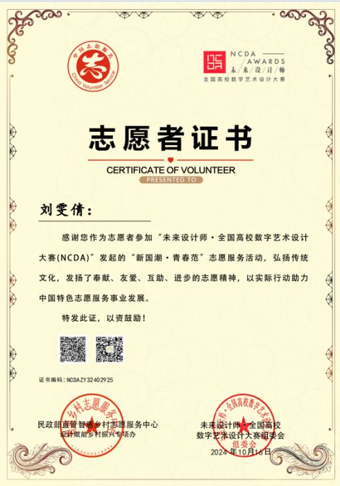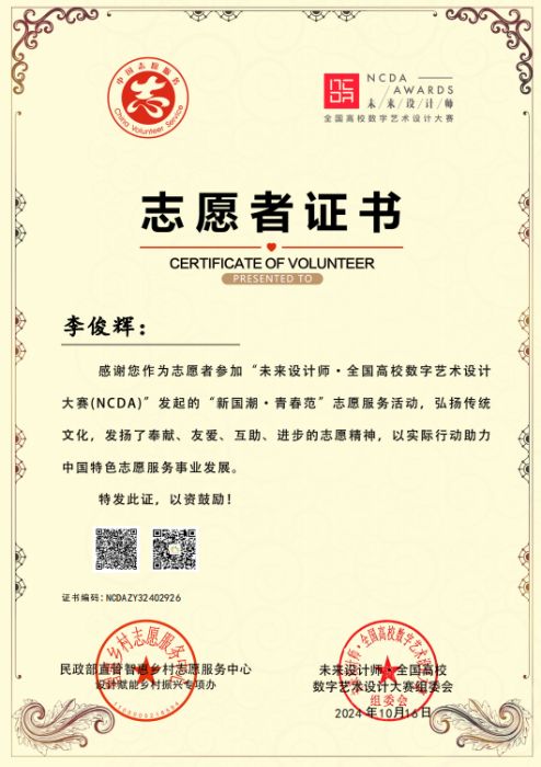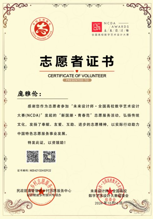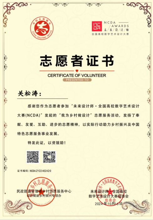 此外👩🏼⚕️,为发挥学科竞赛“立德树人”功能,为弘扬奉献、友爱🧚🏽♂️、互助、进步的志愿精神,表彰在的优秀者🥰,未来设计师·全国高校数字艺术设计大赛委会与民政部智惠乡村志愿服务中心联合发起了第三届“我为乡村做设计”和“新国潮·青春范”志愿服务活动,彩神Vll师生共有15人荣获志愿者证书👅📉,进一步彰显了彩神Vll师生在以专业知识对振兴乡村建设和社会服务积极响应与参与。