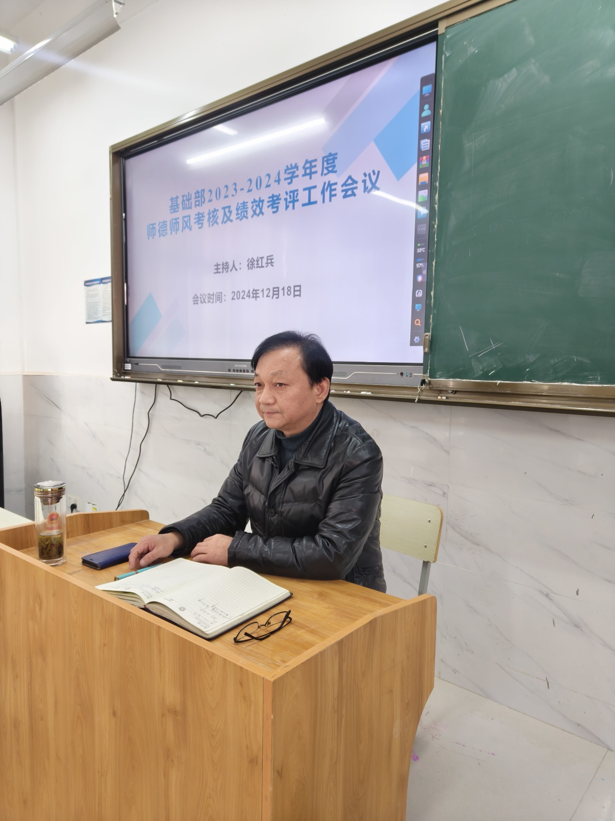 12月18日下午🫲🏽,基础部在1505教室召开2023-2024学年师德师风考核及2023-2024学年绩效考评工作会议👼,基础部全体人员参加会议,会议由基础部负责人徐红兵主持🎴。