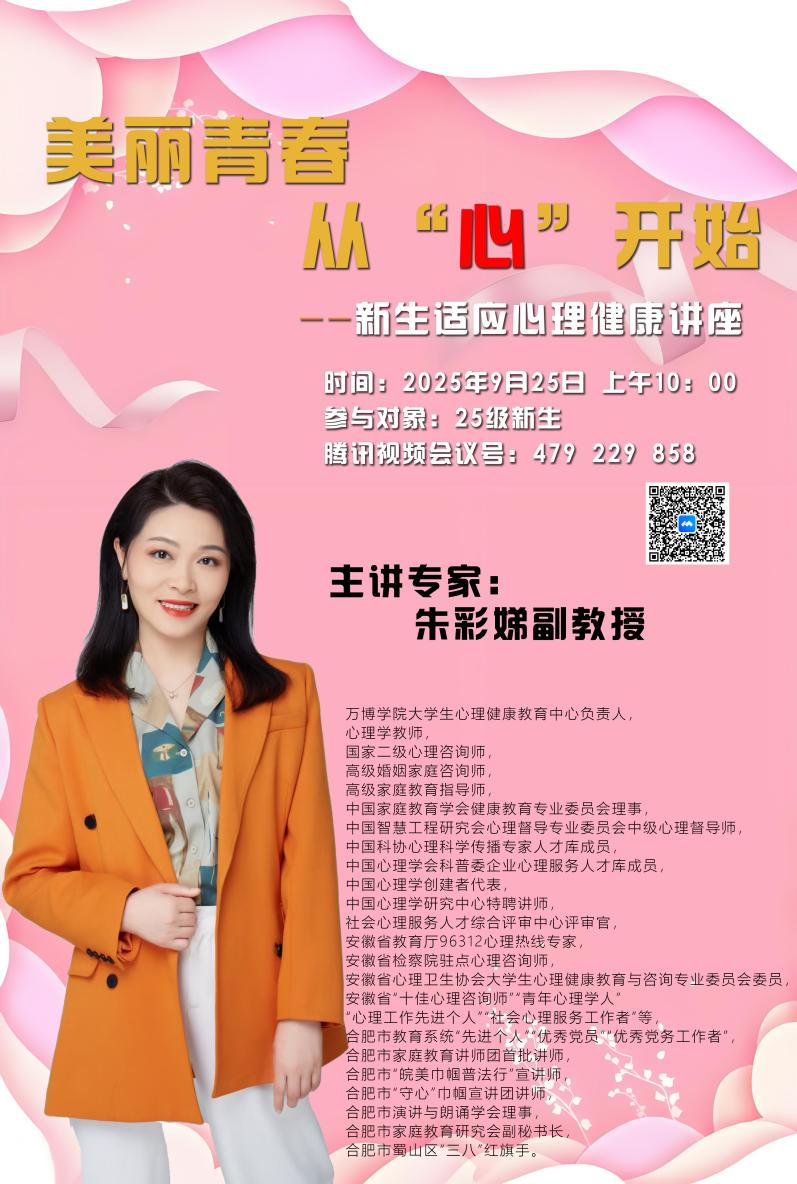 为帮助大家更好地适应大学生活,完成角色转变,彩神Vll大学生心理健康指导中心负责人朱彩娣老师将于2025年9月25日(周四)10:00,开展主题为美丽青春从“心”开始,新生适应心理健康讲座,助力新生更好地适应大学生活。