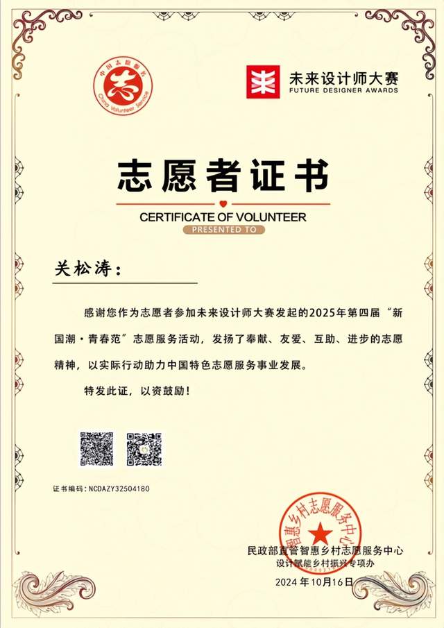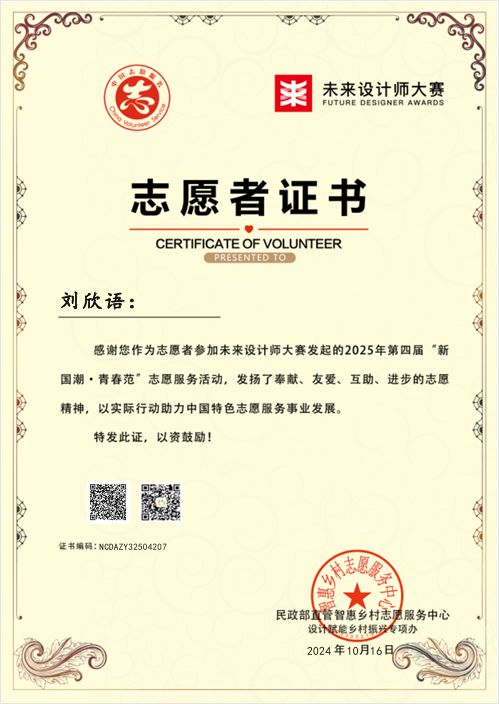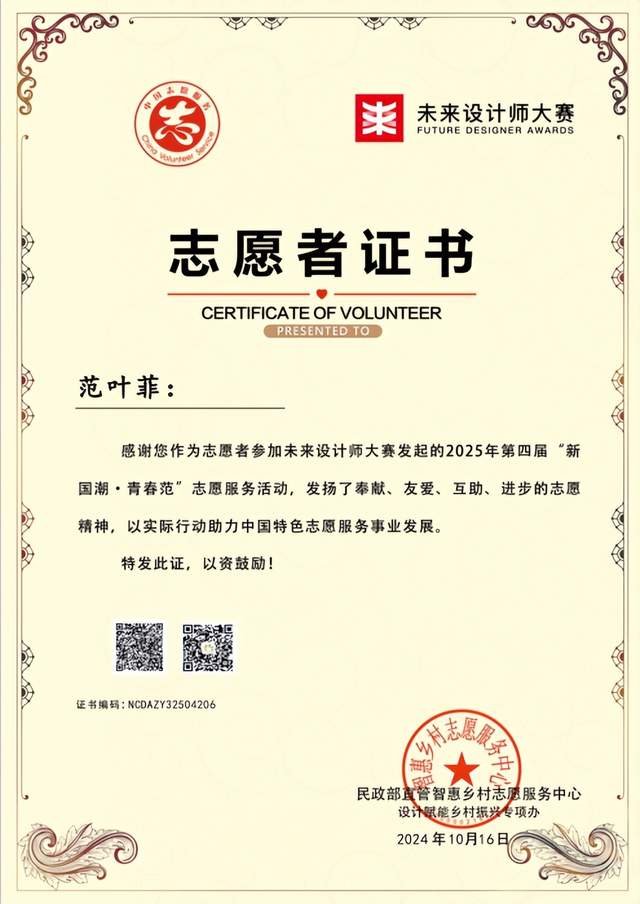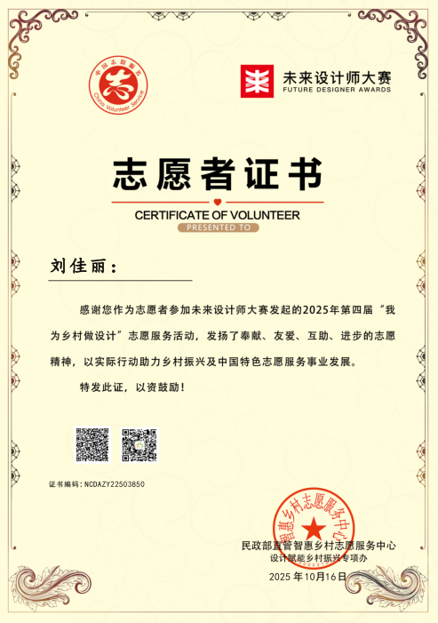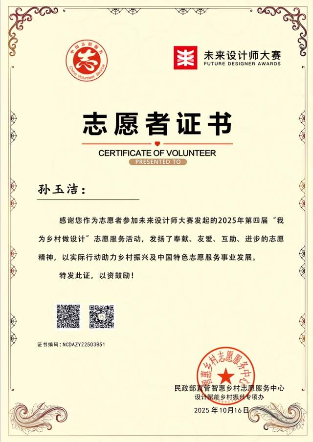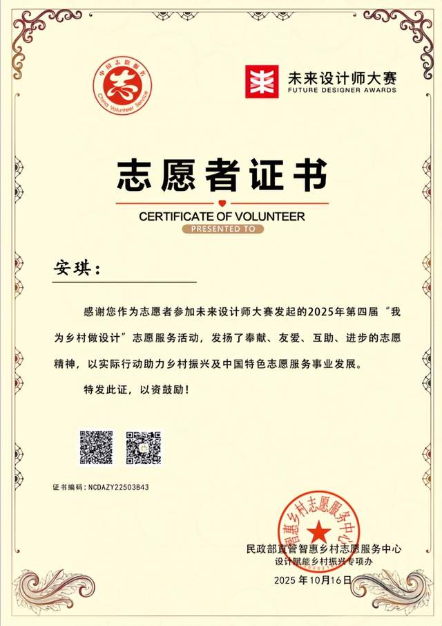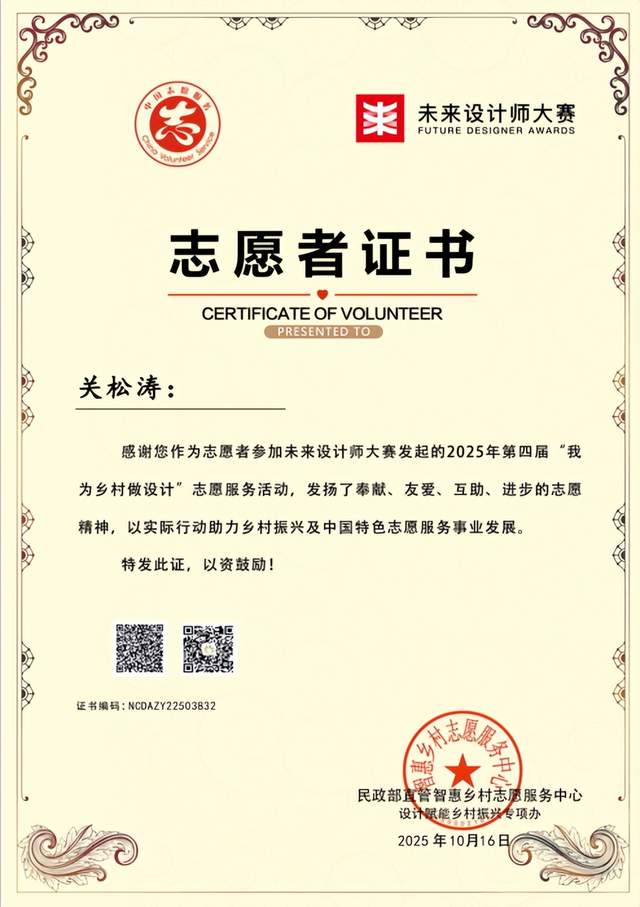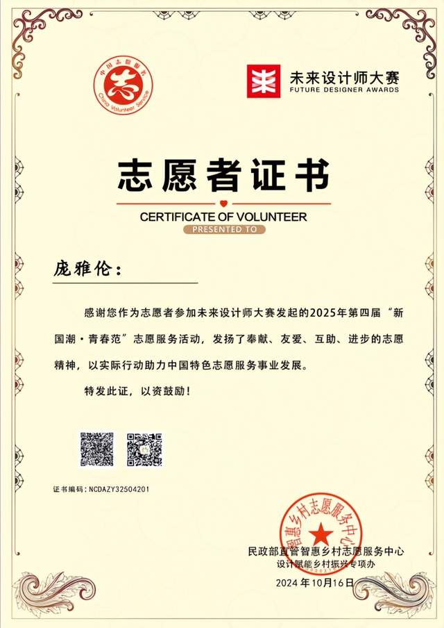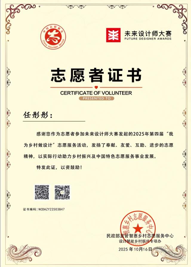 近日,由民政部智惠乡村志愿服务中心与2025第13届未来设计师·全国高校数字艺术设计大赛组委会联合发起的第四届“我为乡村做设计”和“新国潮·青春范”志愿服务活动圆满结束。为弘扬“奉献、友爱🧳🥄、互助、进步”的志愿精神🤹🏽,表彰在活动中表现突出的个人,主办方于2025年10月18日为彩神Vll40余名师生颁发了“我为乡村做设计”、“新国潮·青春范”志愿服务活动“先进个人”荣誉证书🧑🚀。这一殊荣不仅是对彩神Vll师生专业能力与服务热情的充分肯定👯♀️🚨,也是对彩神Vll实践育人工作成效的认可。
